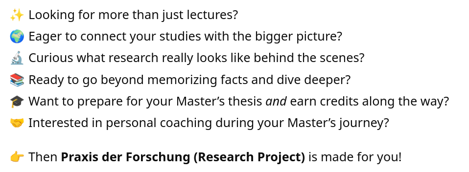 - Folien mit allgemeinen Informationen zu Praxis der Forschung im Sommersemester 2025